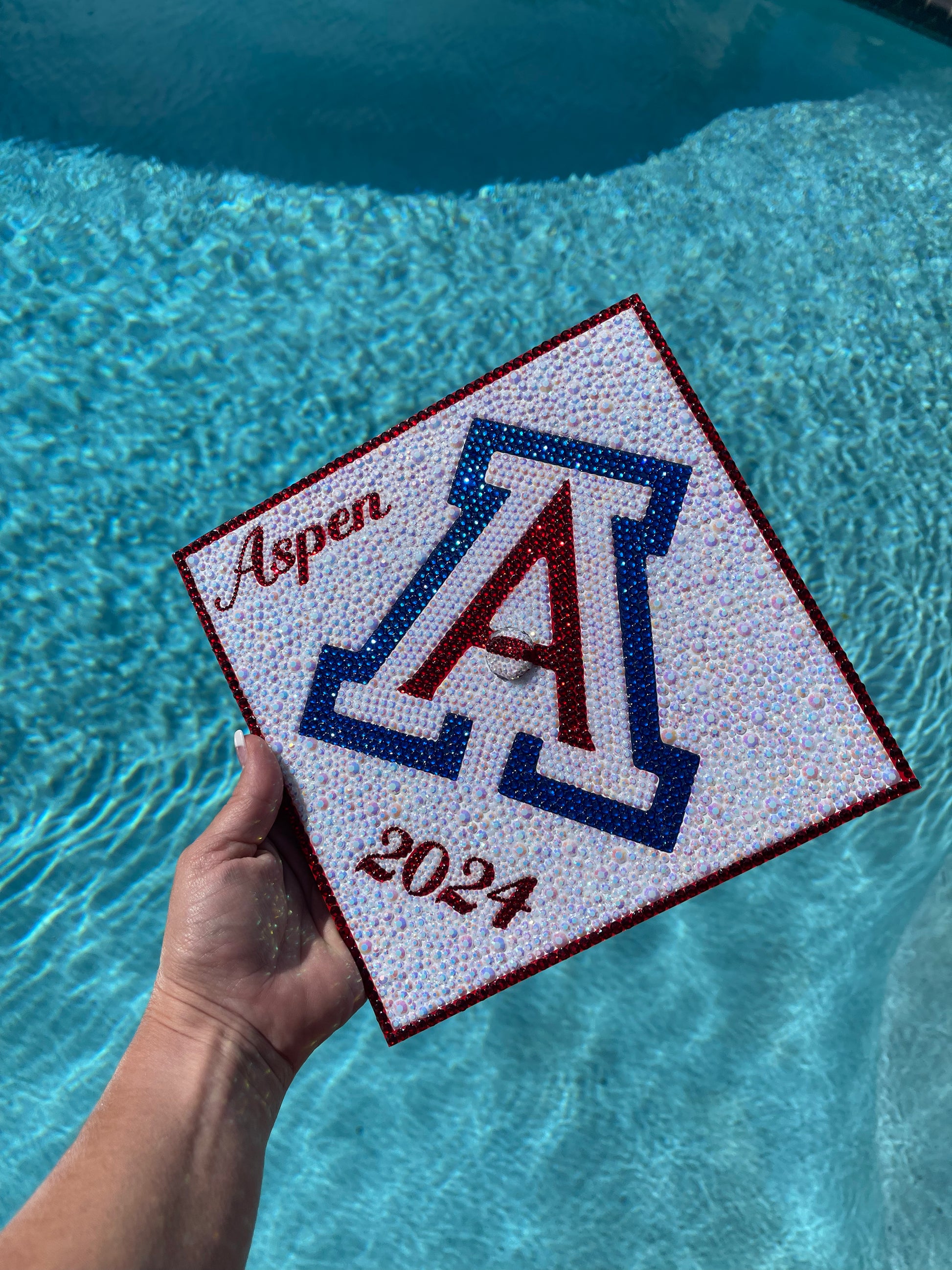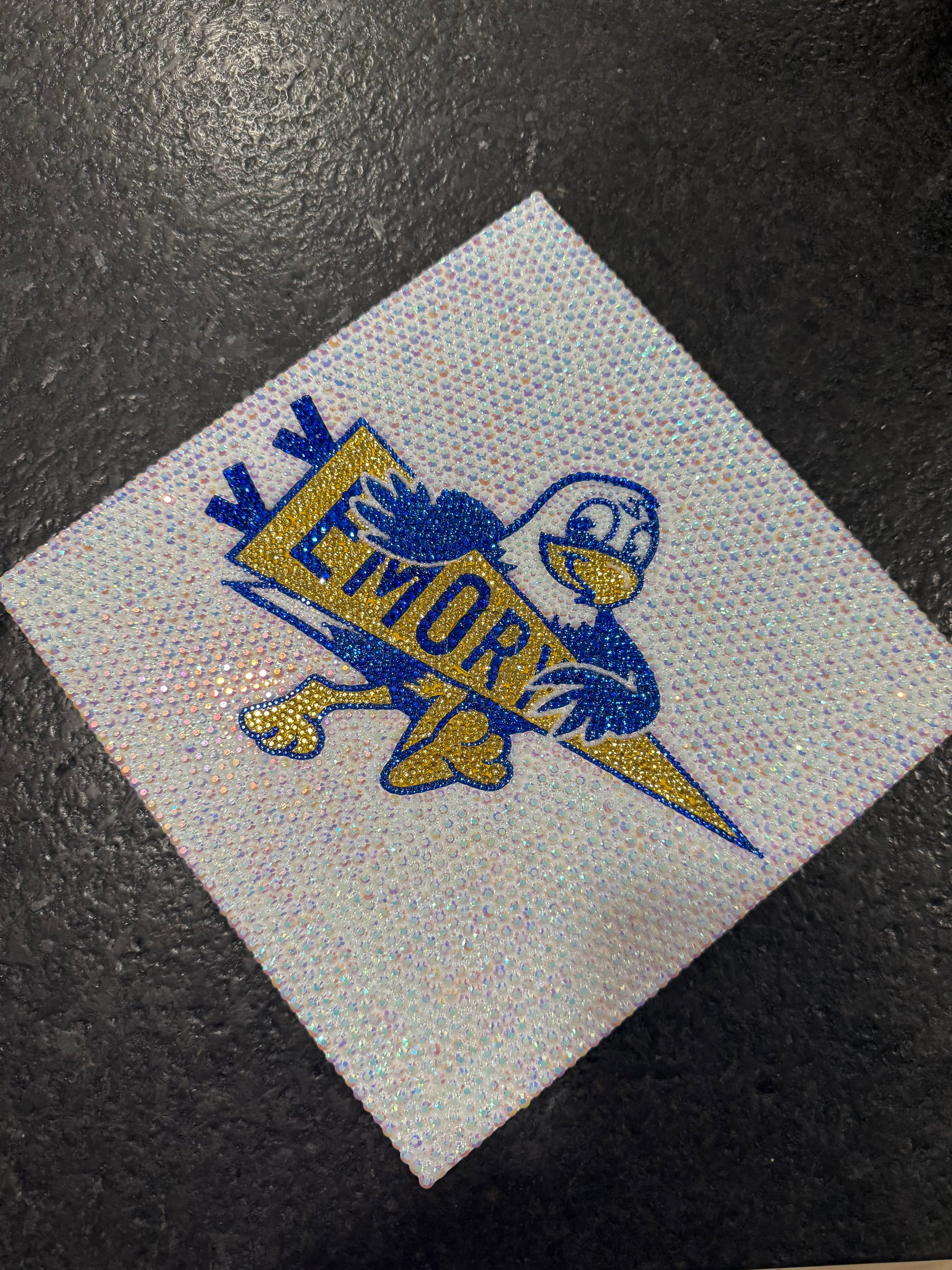 The best part is the you DO NOT need to send me your cap, we will just discuss your thoughts and come up with a design together. once you purchase I will send you a concept proof of your custom rhinestone grad cap then once you purchase the cap we will work together to customize your rhinestone cap. You will receive the bling graduation cap topper and there is instructions on how to place the grad hat topper on your graduation cap, along with the blinged out button.