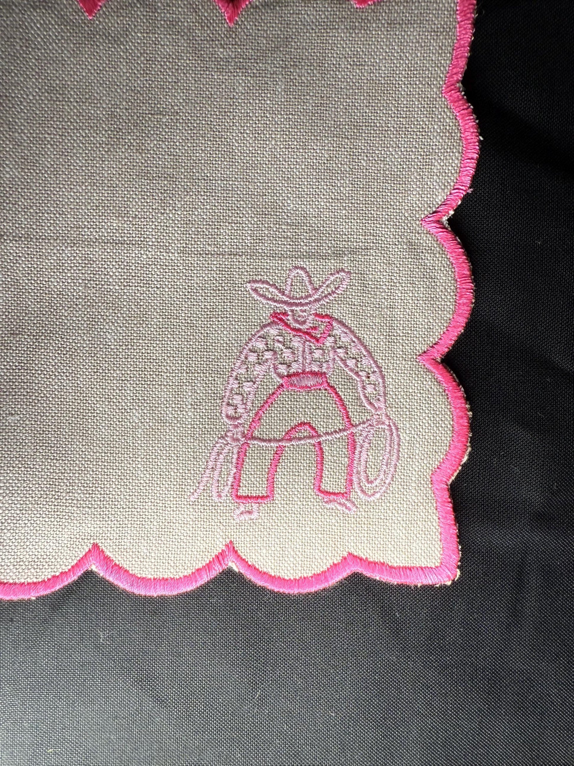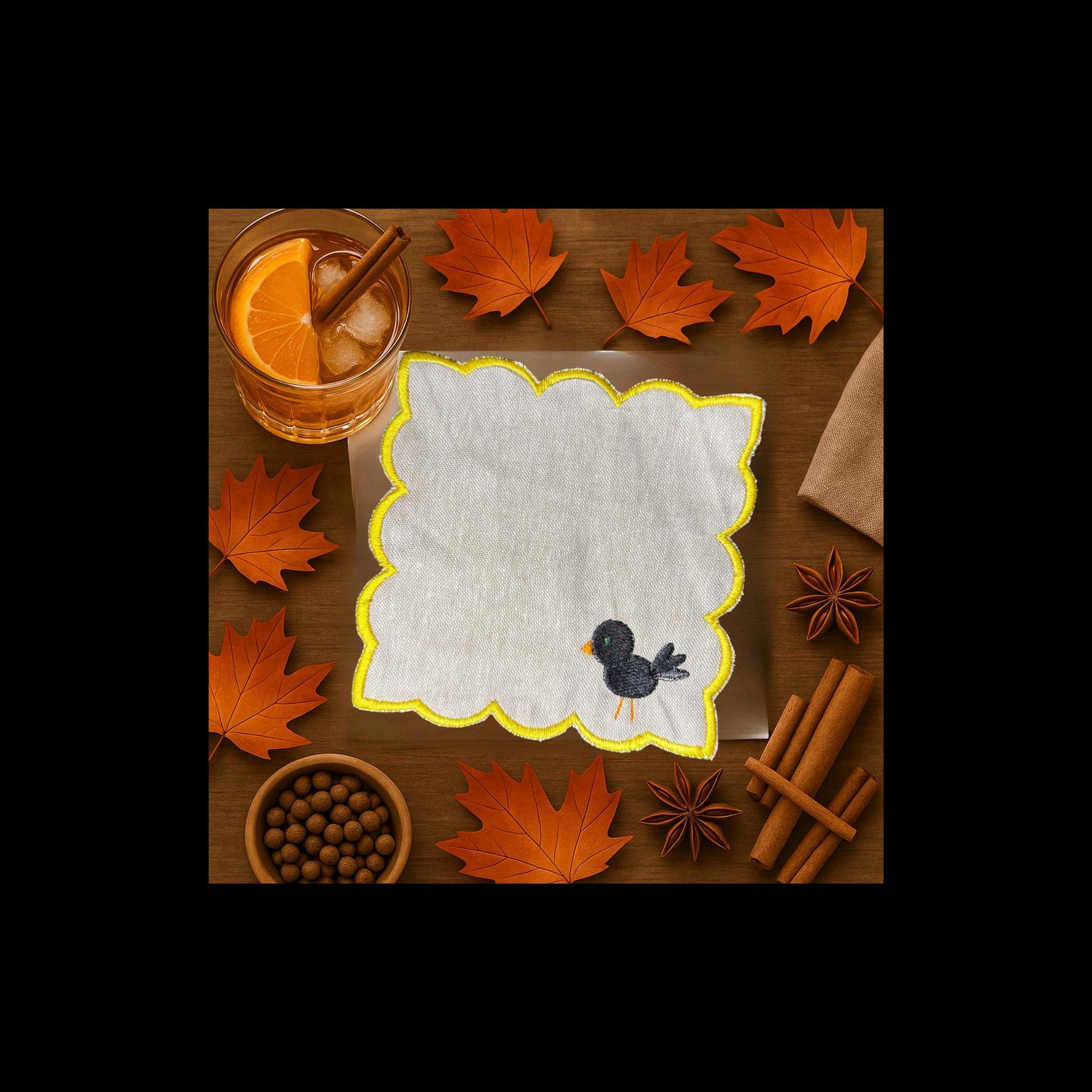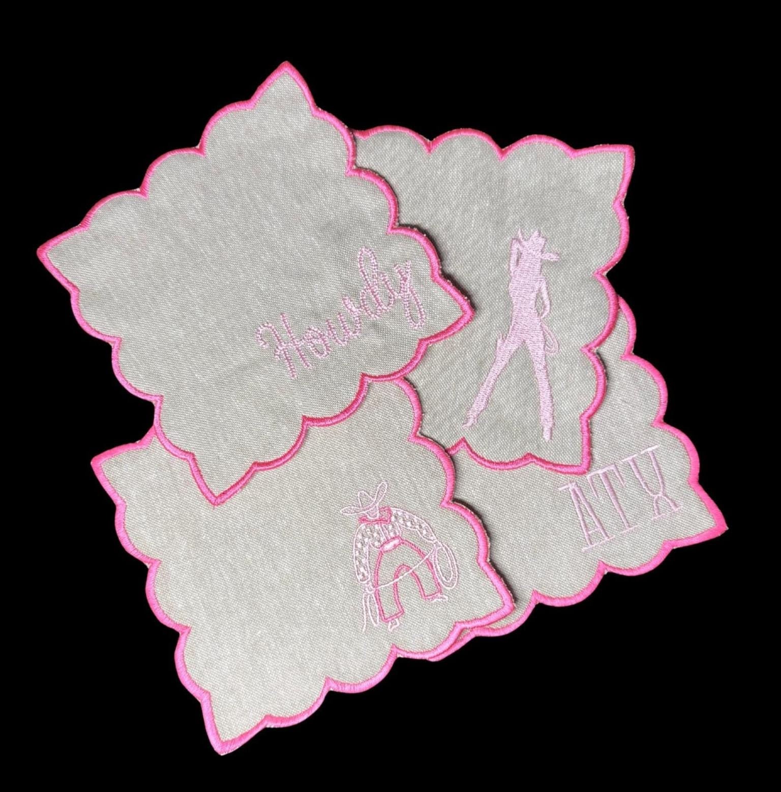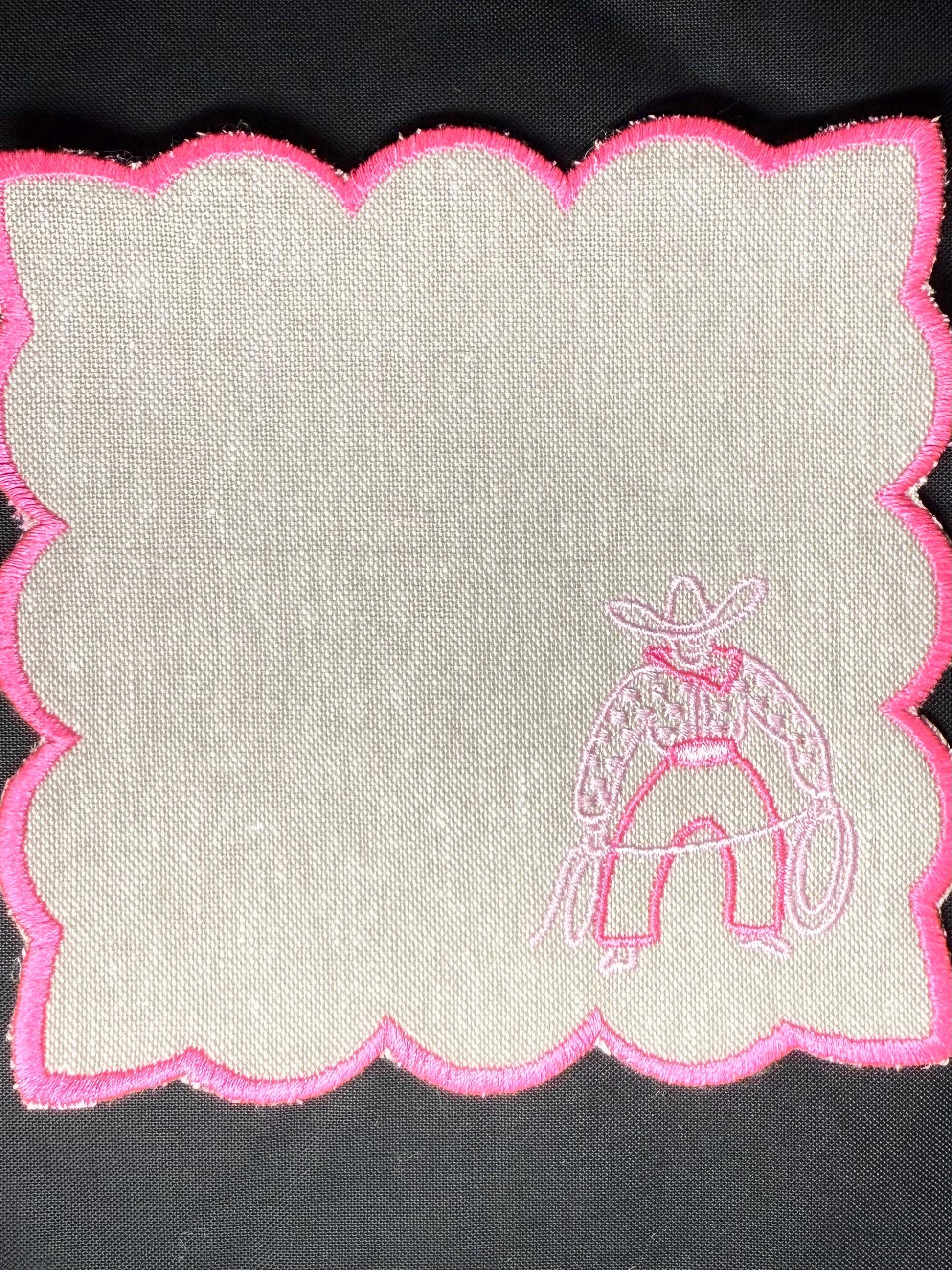 Each Embroidered cocktail napkin is approximately 5x5” 100% linen or cotton-linen blend Multiple thread colors and designs available.